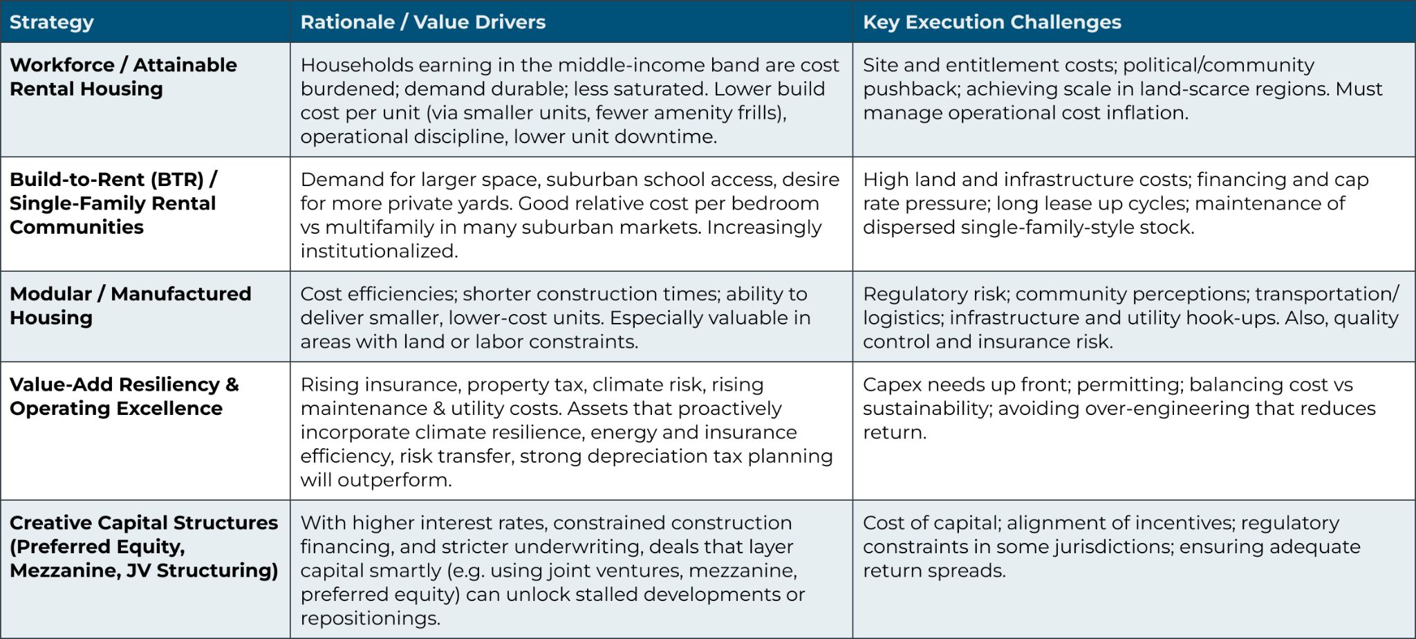 Return expectations vary by strategy and risk. For fully stabilized attainable rental assets in favorable markets, net IRRs might be lower than luxury or high-risk development plays, but risk-adjusted returns (including income yield, stability, and exit potential) remain strong. For value‐add or development / build-to-rent, required return spreads need to account for cap rate compression, construction risk, and soft cost inflation. LPs and sponsors should model downside (longer lease up, higher vacancy, higher expenses) and preserve margin via conservative leverage.