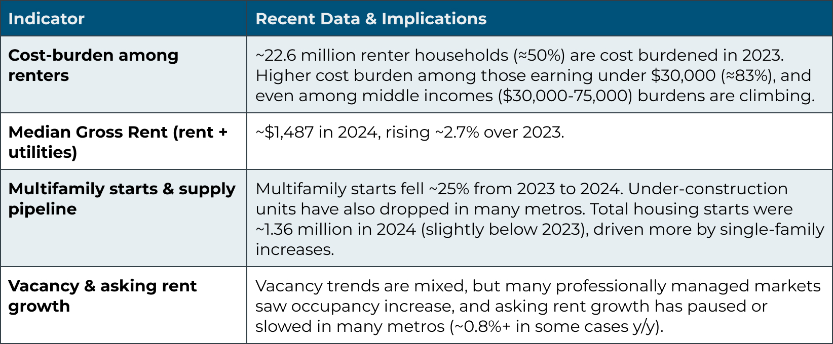 The crisis is not only for low‐income renters. Middle-income households (e.g. incomes $30,000-$75,000) are increasingly cost burdened. That expands the addressable market for “attainable rentals” beyond just “low income / subsidized” segments. - Gap in Affordable New Supply
